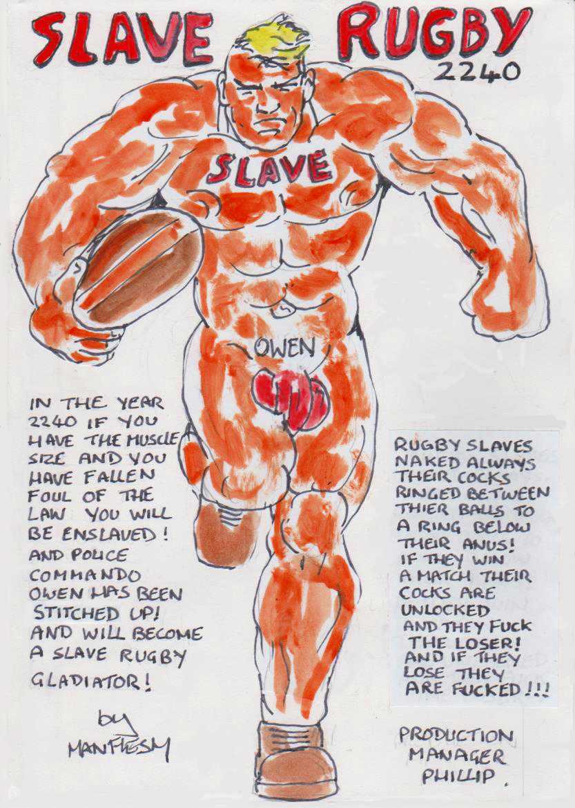 SLAVE RUGBY 2240. IN THE YEAR 2240, ANYONE WHO HAD MUSCLE SIZE AND YOU HAD FALLEN OUT WITH THE LAW, THEY WOULD BE ENSLAVED. POLICE COMMANDO OWEN, HAD BEEN STITCHED UP AND WOULD BECOME A SLAVE RUGBY, GLADIATOR. RUBY SLAVES WERE ALWAYS NAKED. THEIR COCKS RINGED BETWEEN THEIR BALLS, TO A RING BELOW THEIR ANUS. IF THEY WON A MATCH, THEIR COCKS WERE UNLOCKED AND THEY FUCKED THE LOSERS. IF THEY LOST, THEY WERE FUCKED BY THE WINNERS.