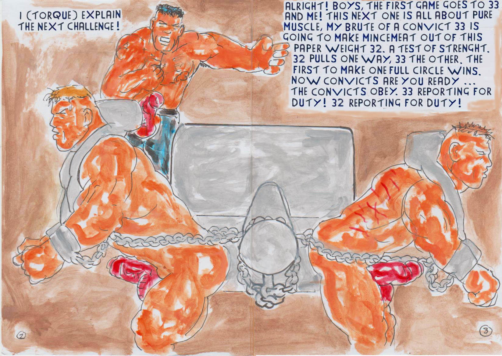PAGES 2 AND 3 FEATURES, 32 AND 33 CONNECTED TO THE SAME PUNISHMENT WHEEL, READY TO START THE SECOND GAME. THE SECOND GAME, WAS A TEST OF BRUTE STRENGTH. TORQUE TOLD THEM THE ONE WHO MADE ONE REVOLUTION FIRST, WOULD WIN.
