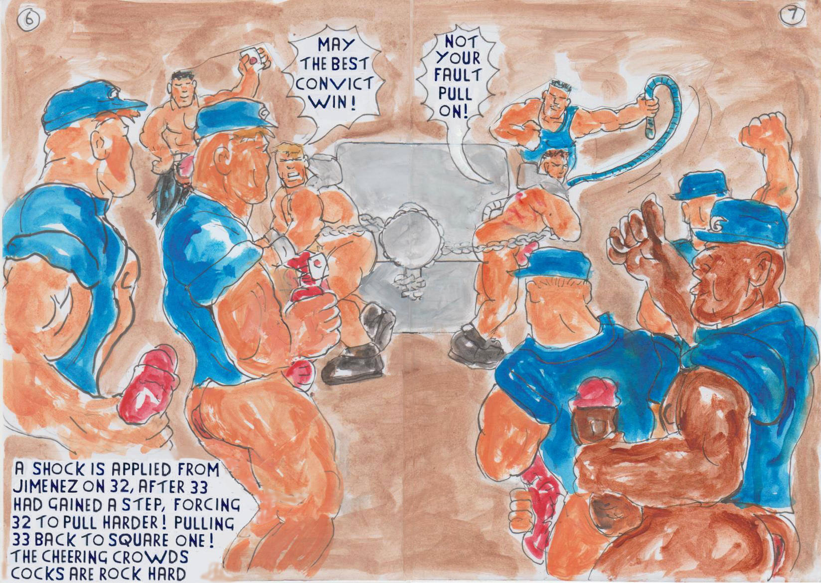 16 HAYDEN'S WHEELS OF SISYPHUS PART 14. THE PARTY AND GAMES CONTINUED. CONVICT 33 WAS UNCHAINED AND TAKEN TO CONVICT 32'S PUNISHMENT WHEEL. THEY WERE CHAINED, BACK TO BACK, TO IT. ASSISTANT CHIEF WARDEN TORQUE, EXPLAINED, THE NEXT CHALLENGE, TO CONVICT 32 AND 33. “OK BOYS, THE FIRST GAME WENT TO 33 AND ME”, TORQUE STATED. “THE NEXT GAME, IS ALL ABOUT, PURE MUSCLES, MY BRUTE, OF A CONVICT 33, IS GOING TO MAKE, MINCE MEAT OUT OF, THIS PAPER WEIGHT 32”, TORQUE BOASTED. AS A TEST OF STRENGTH, 32 WAS MADE TO PULL ONE WAY AND 33 THE OTHER. “THE FIRST ONE TO PULL THE WHEEL ROUND, ONE FULL CICUIT WILL BE THE WINNER”, TORQUE TOLD THEM, AS THEY, READIED TO TAKE UP THE STRAIN. “CONVICTS ARE YOU READY?”, TORQUE ASKED. THEY OBEYED. “CONVICT 33 REPORTING FOR DUTY”, 33 REPLIED. “CONVICT 32 REPORTING FOR DUTY”, 32 REPLIED. TORQUE PRESSED THE BUTTON ON HIS ZAPPER, TURNING IT ON AND SHOCKING 33, TO URGE HIM, ON. 33 CRIED OUT AND STARTED TO PULL. WARDEN JIMENEZ, LASHED 32, TO SPUR HIM ON. MAKING 32 CRY OUT AND START TO PULL. “MAY THE BEST CONVICT WIN?”, TORQUE SAID. 33 AND 33 BOTH STARTED TO STRAIN HARD. JIMENEZ SHOCKED 32, FORCING 32 TO PULL HARDER. WHEN 33 HAD GAINED, A FULL STEP ON 32. WITH EXTRA EFFORT, 32 WAS ABLE TO PULL 33, BACK THAT STEP. THE CROWD OF GUARDS CHEERED, THEIR COCKS, ROCK HARD. AS 33 AND 33 STRUGGLED AGAINST EACH OTHER. “NOT YOUR FAULT KEEP PULLING”, TORQUE SAID, AS HE LASHED 33.