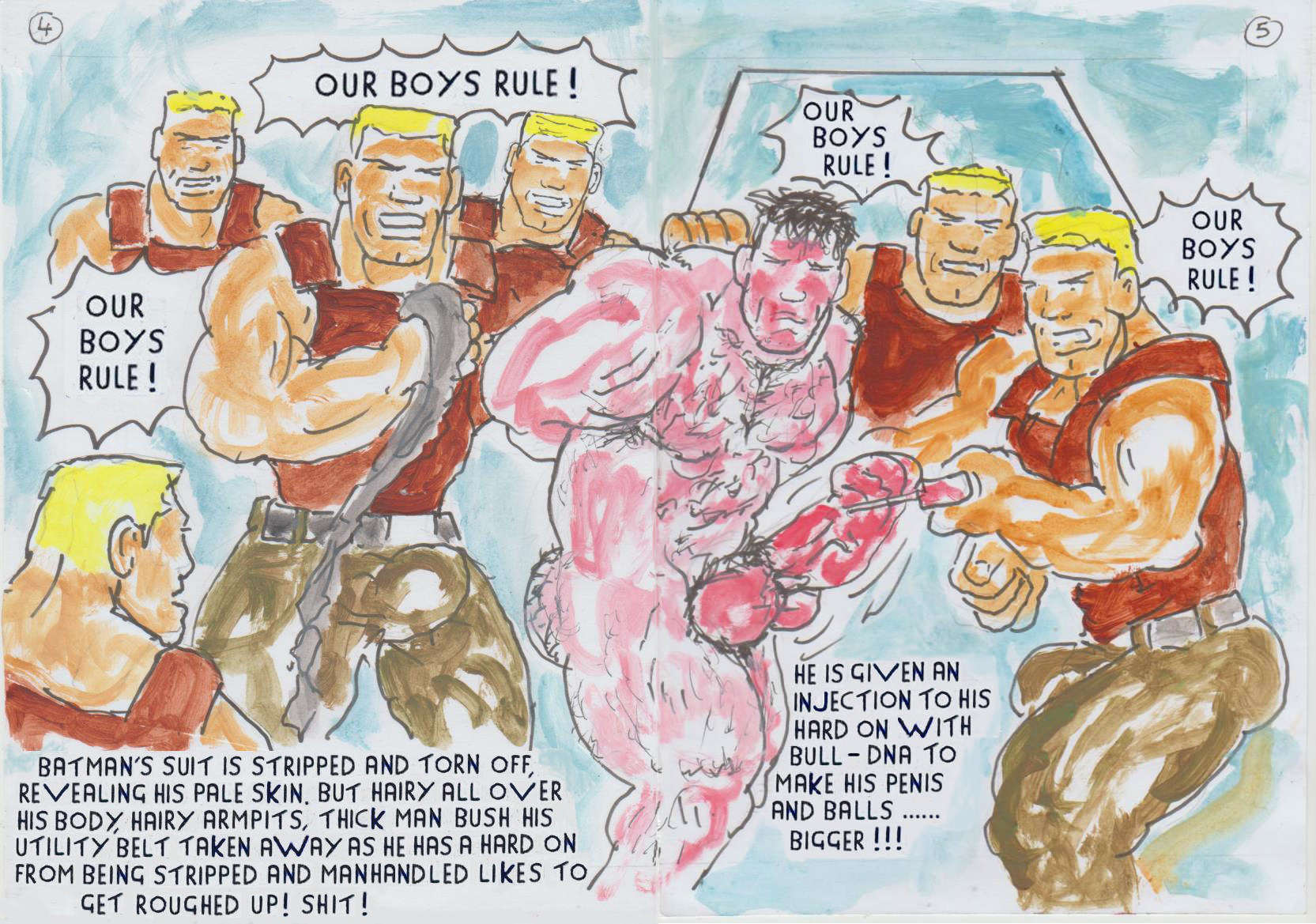 PAGES 4 AND 5, FEATURES, BATMAN STIPPED NAKED, BY THE CLONES, GETTING HARD FROM BEING MAN HANDLED. BATMAN BEING GIVEN AN INJECTION OF BULL DNA IN HIS PENIS, TO MAKE HIS BALLS BIGGER.