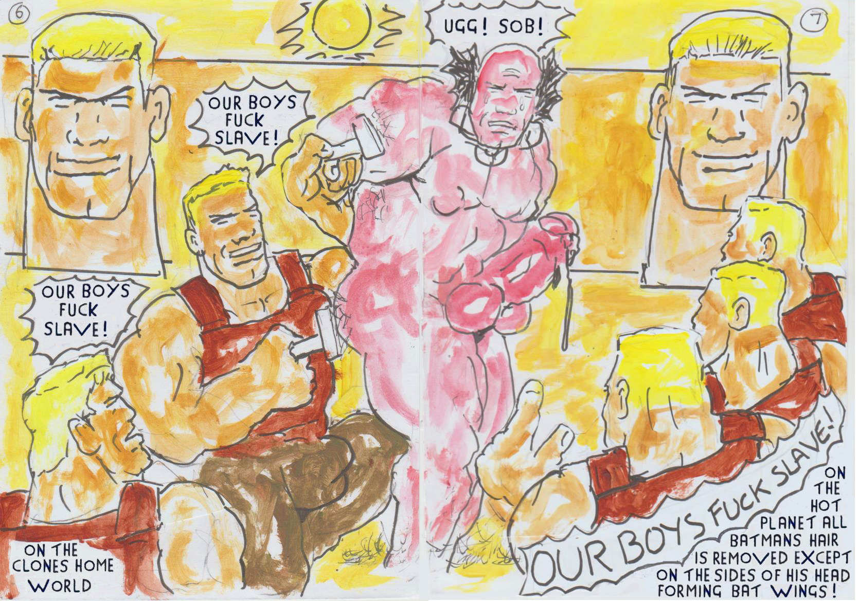 PAGES 6 AND 7 FEATURES, BATMAN ON THE CLONES HOT WORLD, HIS NAKED BODY, SHAVED BY THE CLONES. ONLY HAIR ON THE SIDES OF HIS HEAD, SHAPED LIKE BAT WINGS WAS LEFT. THE CLONES CHANT OUR BOYS FUCK SLAVE.