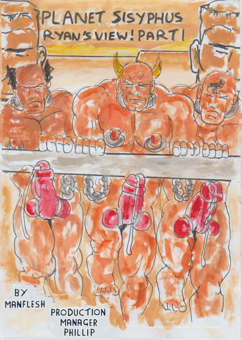 PAGES 8 AND 9 FEATURES, SUPERMAN IN A SLAVE YOKE, TURNING THE WHEEL OF SISYPHUS, UNDER THE MOONS, BAKING SUN. SHITTING AND PISSING, LIKE THE BEAST, HE NOW WAS. HE HAD A STAINLESS STEEL COCK RING, WITH A ELECTRIC SHOCKER, ON HIS COCK AND BALLS. A CLONE THREATENED, TO FRY HIS BALLS OFF, HE STOPPED TURNING THE SISYPHUS WHEEL.