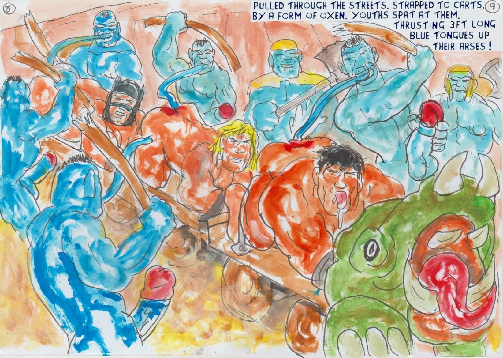 PAGES 8 AND 9 FEATURES. THE THREE NAKED CAPTURED SUPER HEROES, BOUND ON CARTS AND PULLED THROUGH THE STREETS. WITH YOUTHS SPITTING AT THEM AND THRUSTING THEIR, THREE FOOT LONG TONGUES, UP THE THREE NAKED CAPTURED SUPER HEROES ARSES.