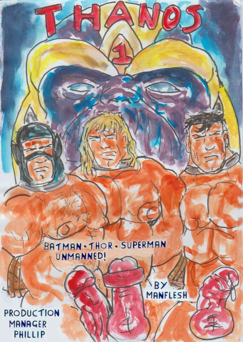 46 THANOS 1, BATMAN, THOR, SUPERMAN UNMANNED. WITH THANOS AIMING, FOR DOMINATION, OF THE COSMOS. THE ONLY WAY TO STOP HIM, WAS TO TAKE HIM OUT AT SOURCE. A SPECIAL SPACE CRAFT WITH SPECIAL FUEL, WIOULD BE USED TO GET, THE THREE SUPER HEROES THERE. ONCE ON BOARD, BATMAN THOR AND SUPERMAN NEEDED TO STRIP DOWN, TO SAVE FUEL. BATMAN INSISTED, ON KEEPING HIS MASK ON. THEY FOUND OUT WHAT THE SPECIAL FUEL WAS. THE SPACE CRAFT, WAS FUELLED BY SEMEN. FOR SPEED THEY ONLY WORE COD PIECES, AS THANOS'S PLANET WAS HOT, THEY WOULD NOT NEED, CLOTHING. AS THEY GOT NEARER TO THANOS'S PLANET, THE FUEL STARTED TO RUN OUT. SO THOR WHO WAS NOT SHY, ABOUT WANKING, WENT FIRST STUCK HIS COCK IN THE ENGINE AND WANKED TO TOP THE FUEL UP. SUPERMAN WAS NEXT, WHEN HE STRUGGLED TO CUM. THOR KINDLY FINGERED SUPERMAN'S ANUS, TO MAKE HIM CUM. WITH A TRILLION MILES STILL TO GO, THE RELUCTANT BATMAN, THE SPOILER OF ALL PARTIES, WAS MADE TO ADD CUM, MORE FUEL, TO THE ENGINE, AGAIN AND AGAIN.