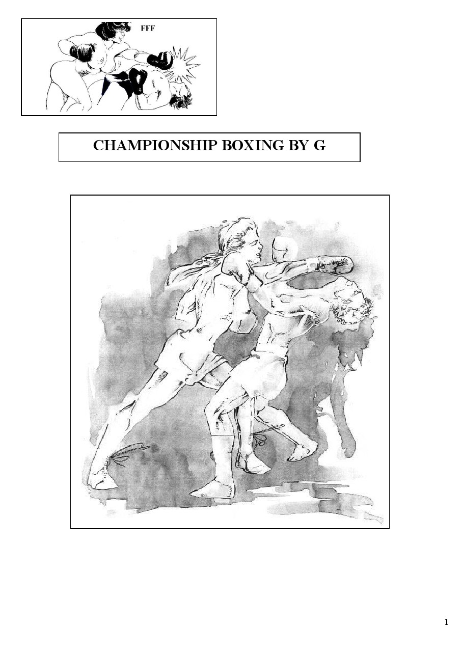 7 CHAMPIONSHIP BOXING. CORY THUNDER AT 26 IS THE INTERGENDER WORLD BOXING CHAMPION. CORY 5’ 10” AND A 164 lbs DEFENDS HIS TITLE FOR THE EIGHT TIME AGAINST MARK HAZEL 23 5’ 9” AND 161 lbs. MARK IS FAST RISING STAR HAVING BEING UNDEFEATED IN NINETEEN FIGHTS. THE FIRST ROUND IS QUITE SLOW AND CORY WINS IT ON POINTS. IN ROUND TWO THEY EXCHANGE PUNCHES THEN CORY GETS THE UPPER HAND PUMMELLING MARK WITH A FLURRY OF HARD TELLING PUNCHES THAT LAYS HI OUT COLD AND HE FAILS TO BEAT THE COUNT. CORY’S WINNING STREAK CONTINUES FOR SIX MONTHS AS HE DISPATCHES EL DE MEXICO THE MEXICAN CHAMPION. ISABELLA TARKINGTON BRITISH CHAMPION. THE NUMBER THREE CONTENDER JASON SUMMERS. HIS LAST VICTORY WAS AGAINST SANDY COMBS THE CANADIAN DESTROYER.