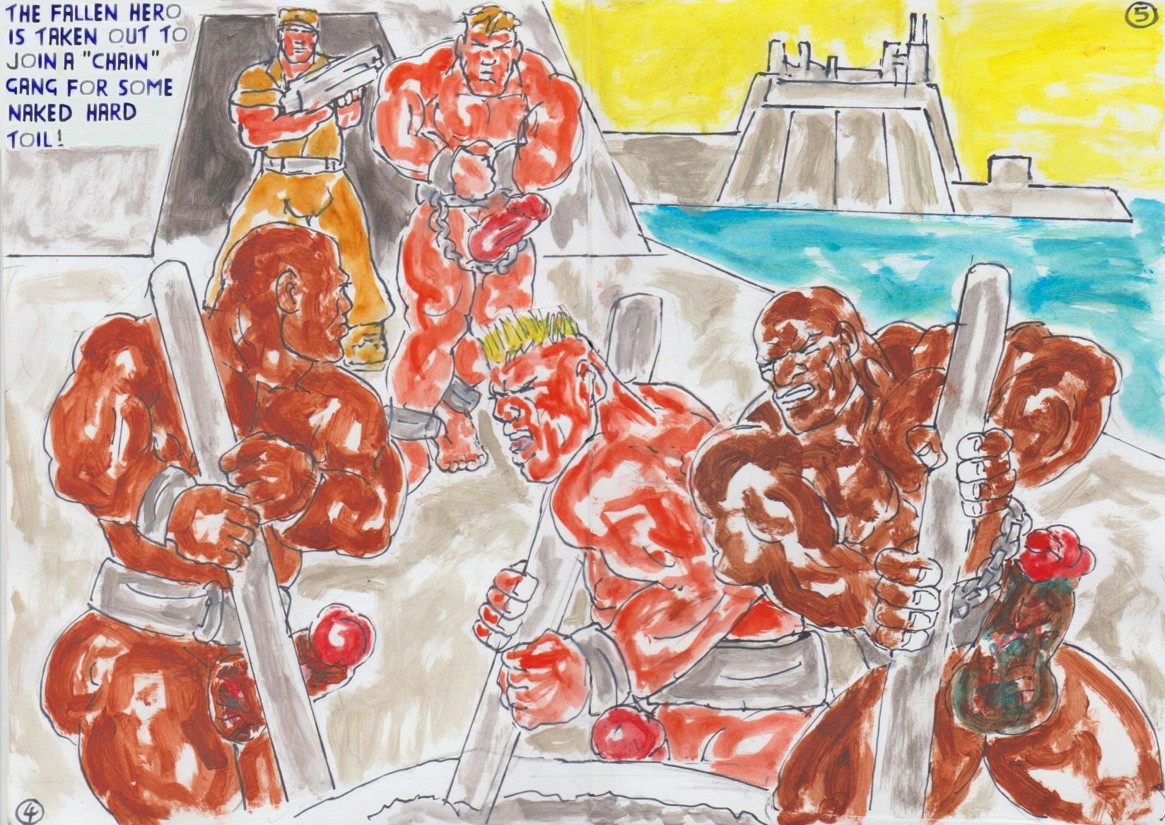 PAGES 12 AND 13 FEATURES, CAPTAIN AMERICA TOILING, UNDER A BLAZING SUN, CARRYING ROCKS, HAVING HIS MUSCULAR BUM WHIPPED BY THE PUNISHER. THE STINGING LASHES TO HIS ANUS, MAKES HIS COCK SPURT, ALL RECORDED ON FILM.