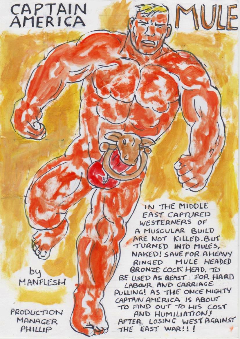 6 CAPTAIN AMERICA MULE PART 1. IN THE MIDDLE EAST, CAPTURED WESTERNERS OF MUSCULAR BUILD, WERE NOT KILLED. THYE WERE TURNED INTO MULES, NAKED, SAVE FOR A HEAVY RINGED, BRONZE MULE HEAD, SHAPED, COCK HEAD. TO BE USED AS BEASTS, FOR HARD LABOUR AND CARRIAGE PULLING. AS THE ONCE MIGHTY CAPTAIN AMERICA, WAS ABOUT TO FIND OUT TO HIS COST AND HUMILIATION, AFTER LOSING A WEST AGAINST THE EAST WAR.