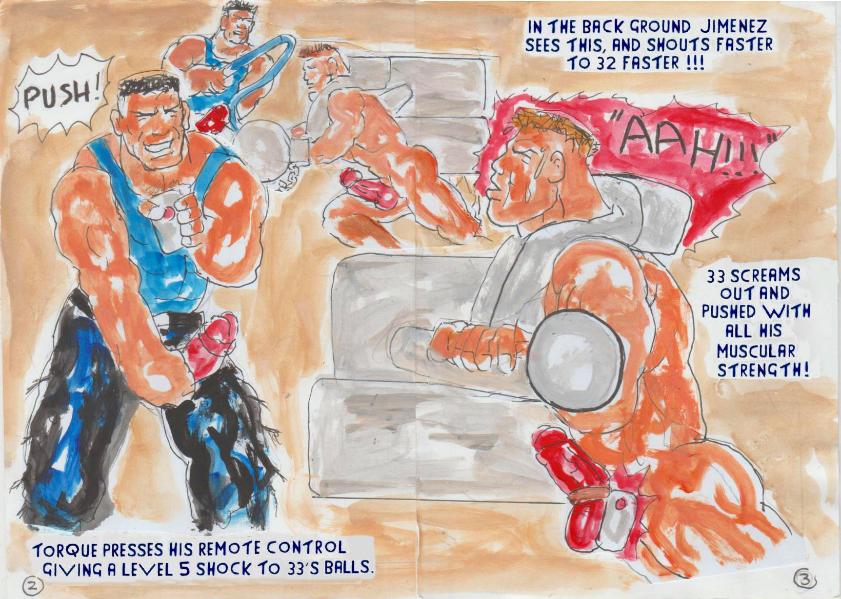 PAGES 2 AND 3 FEATURES, TORQUE SHOCKING 33'S BALLS, URGING HIM TO GO FASTER, AS HE LABOURED TO TURN HIS GRIND WHEEL. IN THE BACK GROUND, JIMENEZ SHOUTING, TO 32 TO GO FASTER.