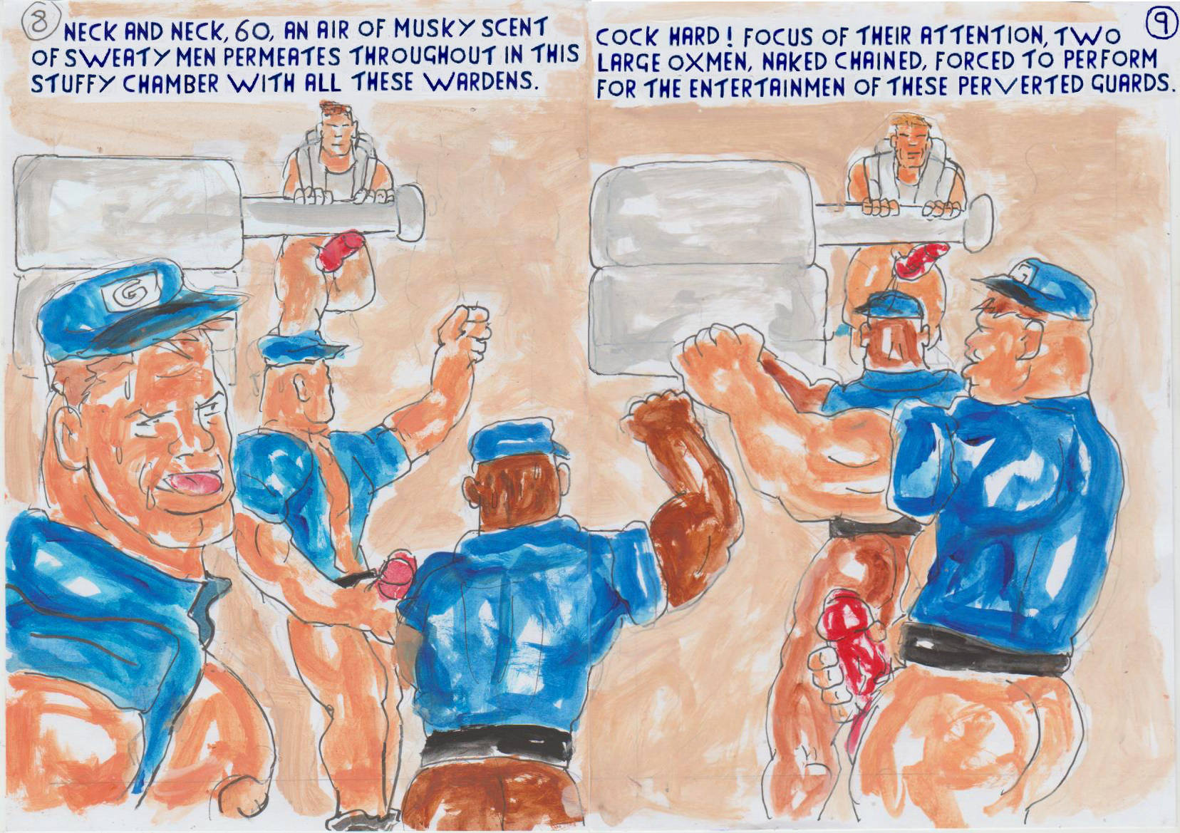 AS CONVICTS 32 AND 33 STRUGGLED ON, CONVICT 32 CAUGHT UP WITH 33. THEY WERE NECK AND NECK ON 50. ANOTHER SHOCK, MADE CONVICT 33 STUMBLE, BUT HE QUICKLY LEVELLED UP WITH CONVICT 32. IT WAS STILL NECK AND NECK, WHEN THEY REACHED 60. THE MUSKY SCENT, OF SWEATY MEN, PERMEATED THROUGHOUT, THE STUFFY CHAMBER, FILLED WITH SO MANY WARDENS. THE FOCUS OF THE ATTENTION, OF THE COCK HARD WARDENS. WERE TWO LARGE OXMEN, FORCED TO PERFORM, FOR THE ENTERTAINMENT, OF THOSE PERVERTED GUARDS.