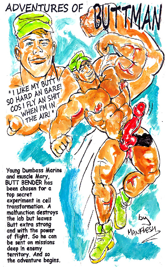 1 THE ADVENTURES OF BUTTMAN. YOUNG DUMB ASS MARINE BUTT BENDER HAD BEEN CHOSEN FOR SOME TOP SECRET CELL TRANSFORMATION. THE TRANSFORMATION GIVES BUTT EXTRA STRENGTH AND ABLE TO FLY. BUTT BECOMES A WEAPON FOR MISSIONS DEEP BEHIND ENEMY LINES. BUTT BENDER FIRST MISSION IS TO RESCUE A MARINE COMBAT UNIT THAT HAS BEEN CAPTURED AND ENSLAVED. A MARINE COMBAT UNIT WAS SENT TO OVERTHROW AN EVIL WARLORD FROM HIS ISLAND FORTRESS OFF THE COAST OF COSTA RICO. THE UNIT IS CAPTURED STRIPPED NAKED AND ENSLAVED. THEY ARE USED AS SLAVES WORKING IN THE MINES AND BEASTED BY THEIR BRUTISH MASTERS.