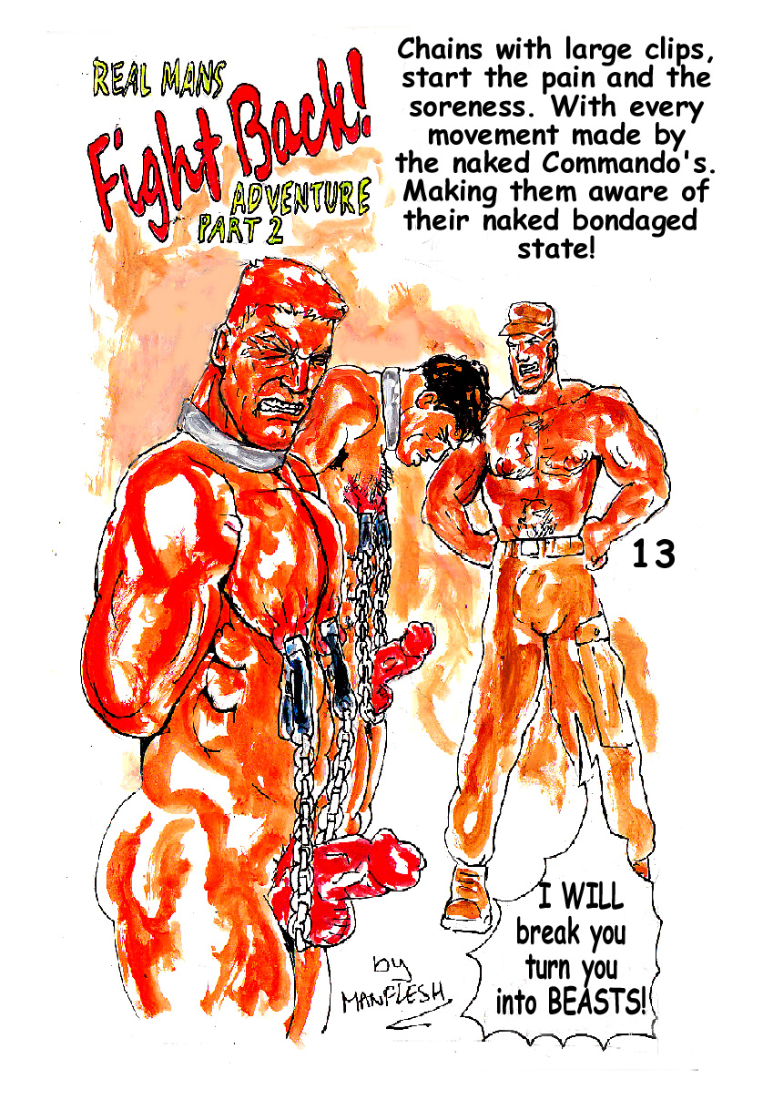 5 FIGHT BACK A REAL MAN'S ADVENTURE PART 2. THEIR INTERROGATION WITH THE COMMANDER BEGINS. CHAINS WITH CLIPS ATTACHED TO RUSTY AND BUCK'S BODIES CAUSES PAIN AND SORENESS TO THE TWO COMMANDOS BODIES AND EVERY MOVEMENT INCREASED THE PAIN AND SORENESS MAKING THEM AWARE OF THEIR NAKED BONDAGE STATE. I AM YOUR MASTER BEND OVER OR I WILL CUT YOUR BALLS OFF?”, THE COMMANDER WARNS RUSTY AND BUCK. HE ORDERS HIS GUARDS TO BRING CANES. RUSTY AND BUCK HAVE NO CHOICE BUT TO OBEY AND TAKE WHAT COMES. THEY HAVE BEEN TRAINED TO TAKE ALL TYPES OF PUNISHMENT. FOR AN HOUR RUSTY AND BUCK ARE SUBJECTED TO A THRASHING THAT LEAVES THEIR BARE BUTTS RED AND ON FIRE. “THERE IS NOTHING LIKE A SOBBING CAPTIVE WITH A SORE ARSE TO MAKE MY COCK HARD”, THE COMMANDER SAID GLEEFULLY. THE TWO BUTT SORE COMMANDOS ARE DRAGGED TO A WOODEN TABLE. LEGS SPREAD WITH BUTT HOLES ON VIEW, THEY KNOW WHERE THE INTERROGATION IS GOING NEXT. THE COMMANDER FUCKS RUSTY'S MAN CUNT AS A GUARD THRUSTS INTO BUCK'S. FOR TOW HOURS THEY ARE GIVEN A GOOD GRINDING. BOTH RUSTY AND BUCK HAVE SPENT HOURS ON FUCK MACHINES BACK AT BASE, SO CAN TAKE WHAT IS COMING.