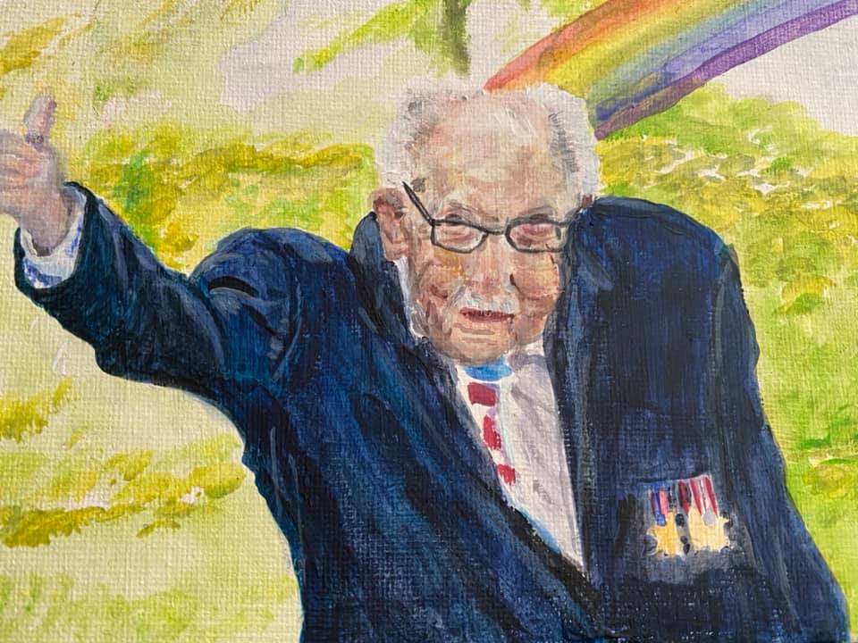Painting of Zelensky as a super hero in the ruins of the steel works