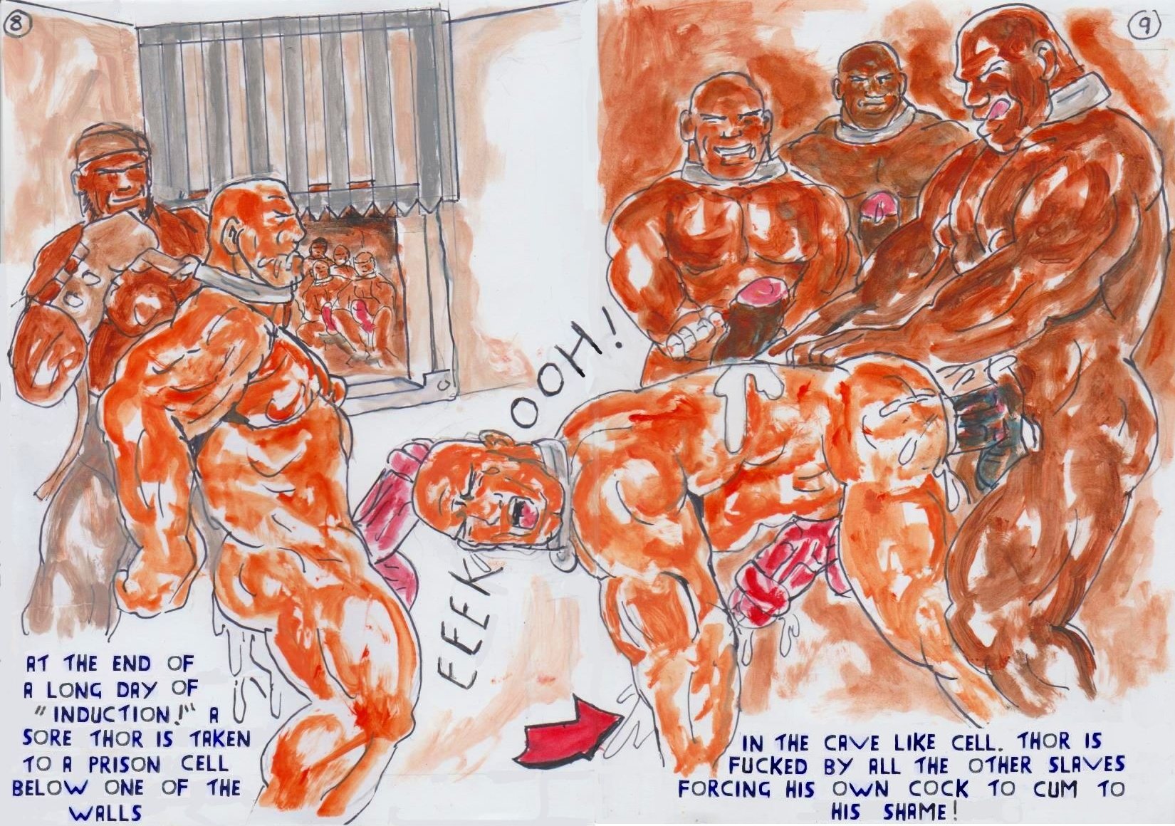 PAGES 8 AND 9 FEATURES, THOR VERY SORE, AFTER A LONG DAY OF HIS INDUCTION, BEING TAKEN TO A PRISON CELL BELOW THE WALLS. THOR IN THE CAVE LIKE CELL, BEING FUCKED, BY ALL THE OTHER SLAVES, MAKING HIM CUM IN SHAME.