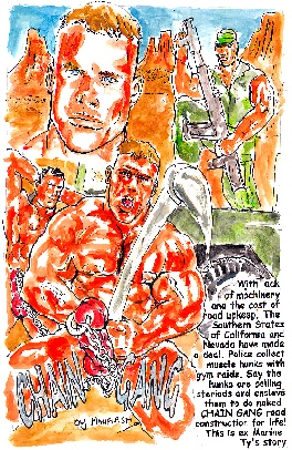 7 CHAIN GANG. EX MARINE TY AND MUSCLE HUNK FALLS FOUL OF THE SOUTHERN STATES OF CALIFORNIA AND NEVADA SECRET AGREEMENT WITH THEIR POLICE FORCES TO KIDNAP MUSCLE HUNKS FROM GYMS ON TRUMPED UP CHARGES OF STEROID ABUSE. THE HUNKS ARE PUT TO WORK ON CHAIN GAIN SAVING THE STATES MUCH NEEDED MONEY ON EXPENSIVE WORKERS AND MACHINERY IN A RECESSION. TY IS INTRODUCED TO HIS NEW HOME BY THE GUARDS ALONG WITH OTHER PRISONERS. THE GUARDS ORDER THE PRISONERS TO STRIP OUT OF THEIR ALREADY REVEALING AND LEWD BOILER SUITS READY FOR THEIR RINGING. TY HAS HIS COCK HEAD PIERCED AND A RING ATTACHED TO IT WHERE A CHAIN CAN BE ATTACHED TO THE RING TETHERING THE PRISONERS TOGETHER TO FORM THE CHAIN GANG.