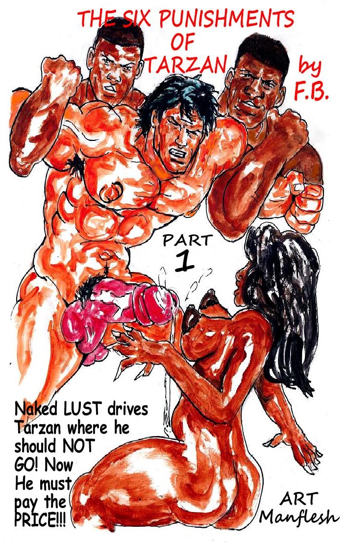 6 THE SIX PUNISHMENTS OF TARZAN PART 1 BY F.B. NAKED LUST DROVE TARZAN WHERE SHE SHOULD NOT HAVE GONE NOW HE MUST PAY THE PRICE. TARZAN CONSIDERED ALL THE JUNGLE HIS DOMAIN HE WAS LORD. HE TOOK A FEMALE AND BLESSING HER WITH HIS WEAPON, AND HE BEAT HIS CHEST AS HE THRUST. TARZAN WAS SEEN RAPING ONE OF WHAT HER TRIBE CONSIDERED WAS ONE OF THEIR VIRGINS. NATIVE MEN SWOOPED OUT OF THE JUNGLE SHRUBBERY, AND GRABBED TARZAN. A FOUNTAIN OF FUCK JUICE TRAILED FROM THE GIRL WHO SCREAMED IN FRUSTRATION AS TARZAN WAS PULLED OFF HER. TARZAN WAS TAKEN BACK TO THE VILLAGE AND INTO THE CHIEF'S HUT. ONCE INSIDE HE WAS STRAPPED UPSIDE DOWN IN AN X FRAME.