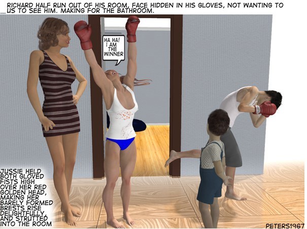 2 TOO BIG FOR HER KNICKERS PART 2. Richard found it hard to live down his defeat against his younger sister and he was taunted at school by other boys. They boxed again and Jussie beat Richard again, this time even more convincingly. Richard was forced to fight Jussie a third time in a desperate bid to recover his male pride.