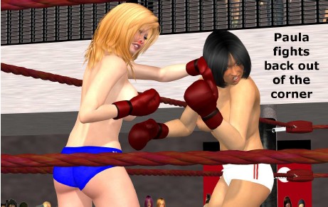 3 THE NEWBIE PART 3. THE NEXT DAY AFTER THE DISAPPOINTING PERFORMACE, AGAINST THE SCOTTISH WRESTLERS, PAULA WAS NOT VERY CHEERFUL, BUT DECIDED TO GO TO THE PUB WITH NICK. THAT TURNED OUT TO BE A PAINFUL MISTAKE. AS PAULA SAT IN THE PUB GARDEN, WHILE NICK WENT TO BUY SOME CIGARS, SHE WAS APPROACHED BY AN ANGRY FEMALE. THE ANGRY WOMAN TOLD PAULA SHE HAD A NERVE SHOWING HER FAT UGLY, FACE THERE. ALTHOUGH SHE DID NOT KNOW WHO THE WOMAN WAS, THE FAT JIBE ANGERED PAULA. BUT BEFORE PAUL COULD REACT, THE WOMAN PUNCHED HER IN THE NOSE. THEY DROPPED TO THE GROUND IN A VICIOUS CAT FIGHT. PAULA MANAGED TO TURN THE TABLES ON THE STRANGE WOMAN AND GAVE HER SOME GOOD PUNCHES, BEFORE SHE WAS DRAGGED OFF HER. PAULA WAS LEFT WITH A BLEEDING NOSE AND SCRATCHED FACE. SHARON WAS HER NAME, AS IT TURNED OUT HAD A BLOODY LIP AND BALLOONING EYE. PAULA'S REWARD FOR BEING ATTACKED UNPROVOKED BY SHARON, WAS TO BE BARED BY THE LAND LORD. AFTER THIS EMBARRASSING INCIDENT PAULA DECIDED TO TAKE UP AN EARLIER OFFER BY ONE OF THE CLUB MEMBERS DAVID, TO TEACH HER HOW TO BOX. DAVID GOT HER GLOVED UP, THEN GOT HER TO SPAR WITH A MALE BOXER, HE WAS ALSO TEACHING, CALLED STEVE. AFTER THAT DAVID GOT STEVE TO TRAIN PAULA AND PUT HER THROUGH HER PACES. AFTER WEEKS OF HARD TRAINING DAVID ASKED PAULA IF SHE WOULD LIKE TO PUT ALL SHE HAD LEARNED INTO PRACTICE A REAL FIGHT. IT WAS TO BE AT FEMALE BOXING TOURNAMENT IN GERMANY. PAULA WOULD BE PAIN HER EXPENSES AND SMALL PURSE FOR ANY FIGHT. PAULA ACCEPTED. SHE WAS GIVE SOME BOXING BOOTS AND SATIN TRUNKS, FOR A PHOTO SHOOT, FOR THE TOURNAMENT PROGRAM.